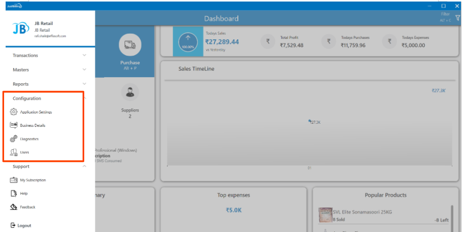 - Configuration - From Configuration page you can manage and configure various functions in Just Billing Application like Application settings, business details, diagnostics and users. (see figure 4).