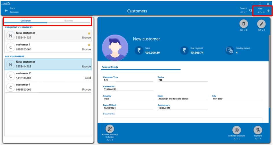 2. Click on New +, By Default toggle button is selected for entering Customer consumer change it to customer corporate