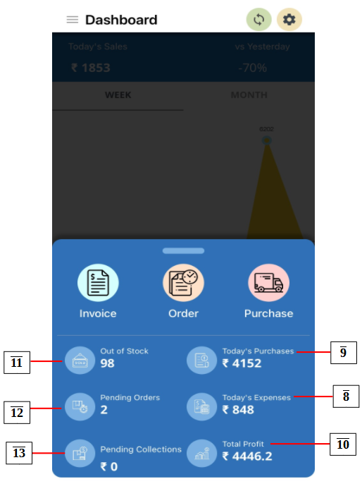 In the Just billing app, the dash board provides at-a-glance view of the various aspects of business data like Invoice,Order,Purchase and Settings. Discussed below are various sections from the dashboard.