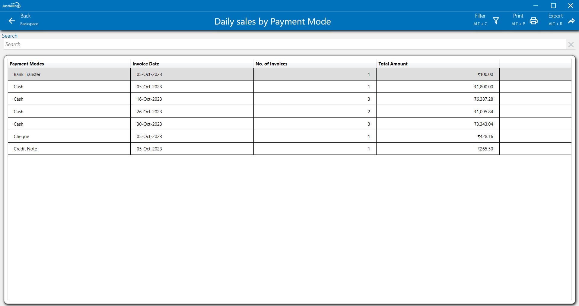 The Detailed Sales by Payment Mode report provides a visual breakdown of total sales based on different payment methods.