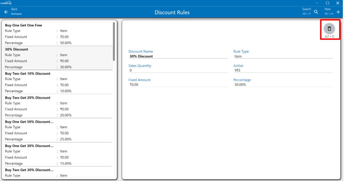5. On Deleting, the discount rule page is updated and reflects in JB Windows application under discount rules page.