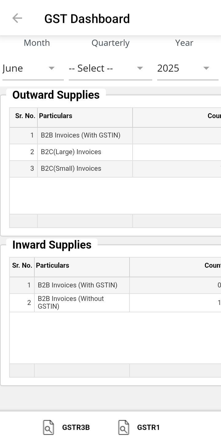 This "GST Dashboard" helps you track your business's tax information. You can see your "Outward Supplies" to customers (like B2B or B2C invoices) and your "Inward Supplies" from suppliers (invoices with or without GSTIN). This makes it easy to review your sales and purchases for GST filing.