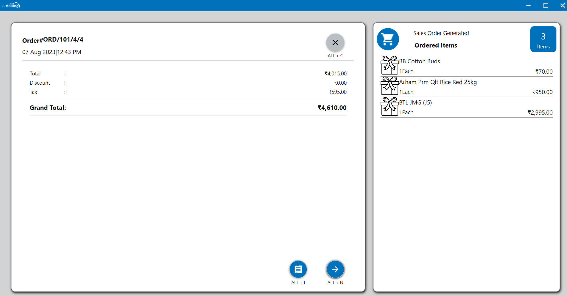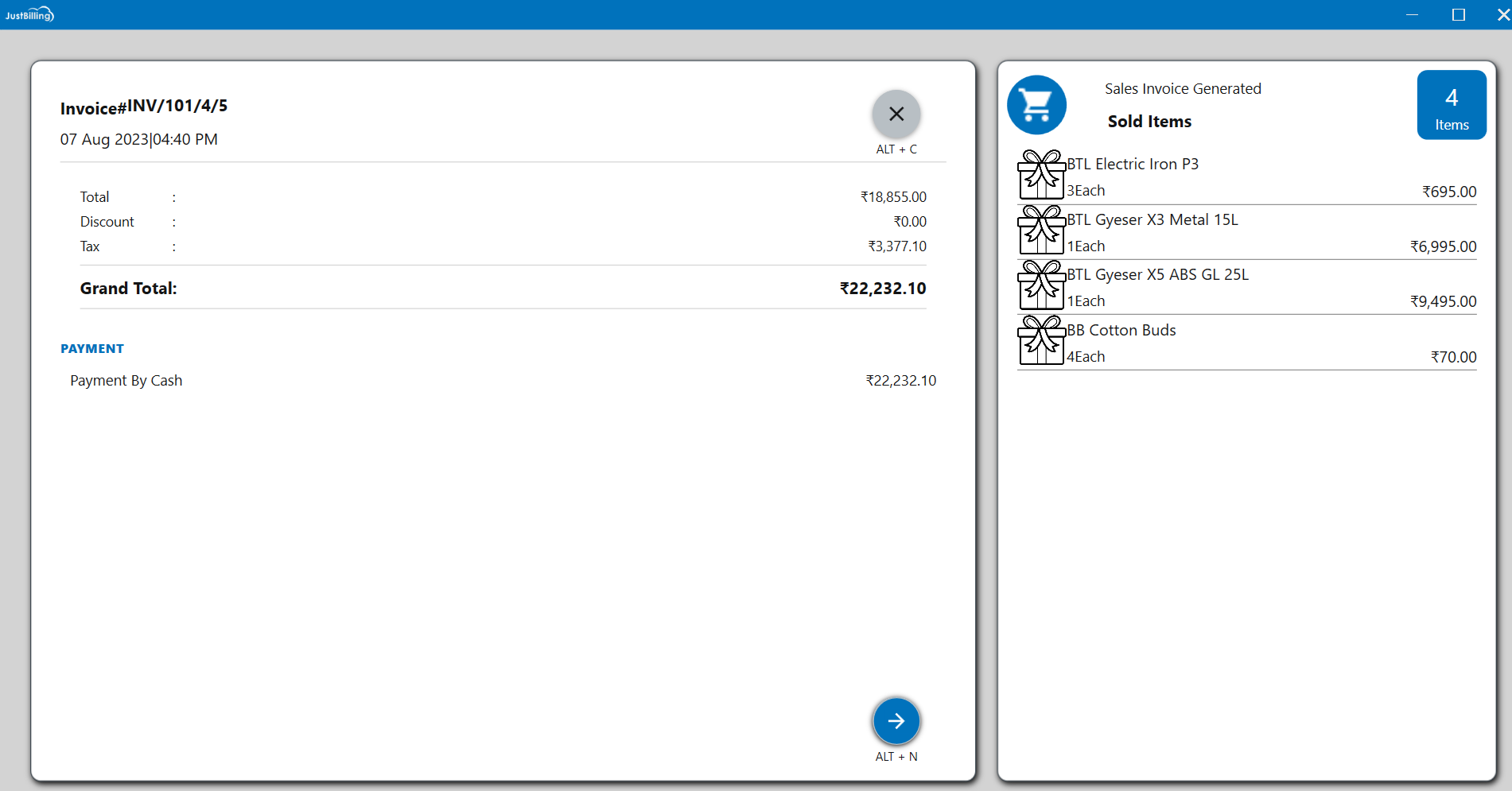 After verifying the products in the cart you can proceed to billing screen by clicking on invoice button or ALT+I