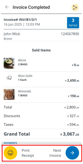 You can either share the bill via sms/email or print it as per customer demand or Skip the process to go on with the payment process.(see figure 15)