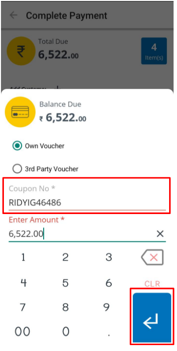 Few stores may provide gift vouchers to attract more customers to visit the store again. While selecting payment option as Voucher, you need to add the coupon number and amount as shown in the screen shot above.(see figure 8)