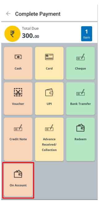 - When a customer is selected at the time of billing, you will get all the payment modes that is Cash, Card, Voucher, Cheque, Redeem, Wallet and on Account.