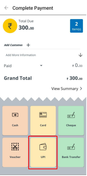 - When no customer is selected from the billing screen, you will get four payment modes, which are Cash, Card, UPI QR, Voucher and Cheque.
