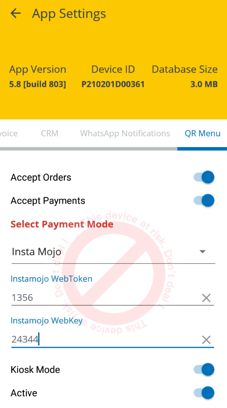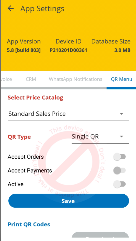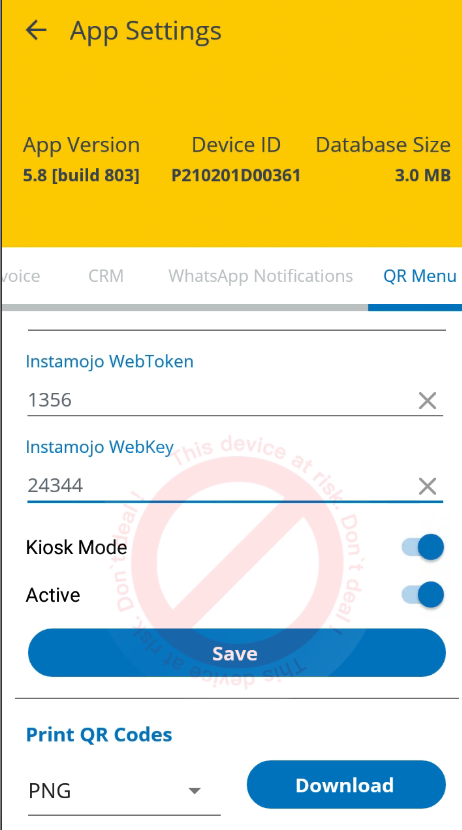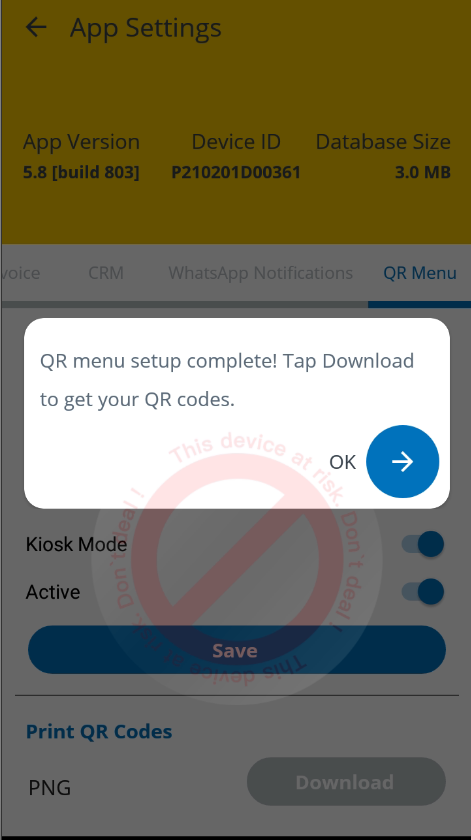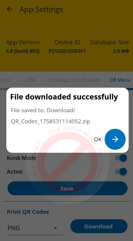 On selecting Save button, System will dislay a message as QR menu setup complete, Tap diwnload to get your QR codes.