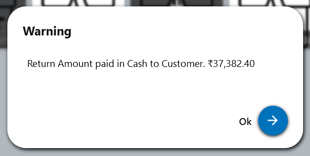 After clicking on Cash button, a confirmation popup of amount refunded to customer is displayed on screen as shown in (Figure 6 - refund amount).