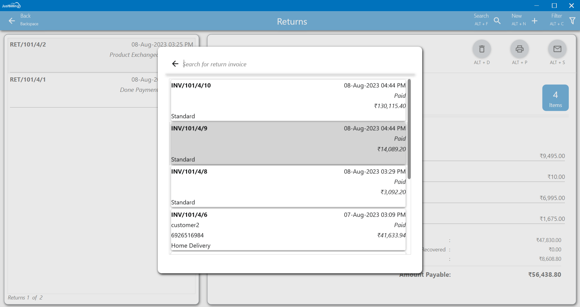 After clicking enter, Invoice is generated and you will be redirected to invoice screen, click on Next button to view the list of exchange and return items.