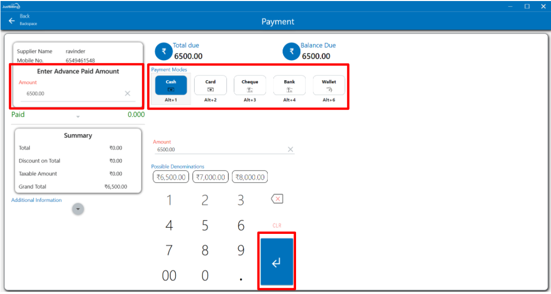 3. Click on Advance Paid Icon, Enter the amount need to be paid to supplier