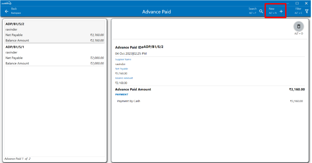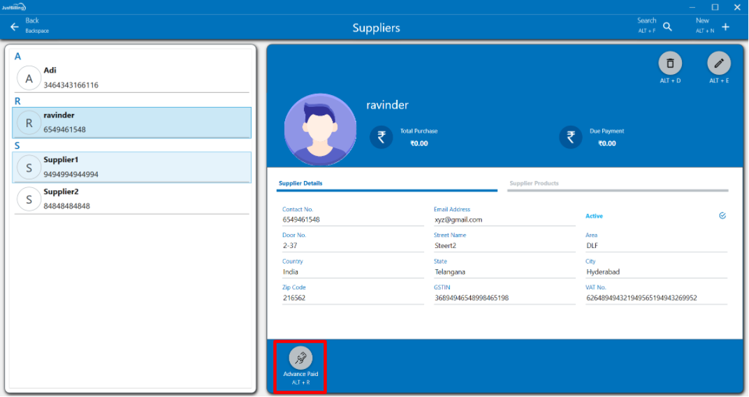 5. On Saving, Advance payment to Suppliers page is updated and reflects in JB Windows application under Suppliers page.