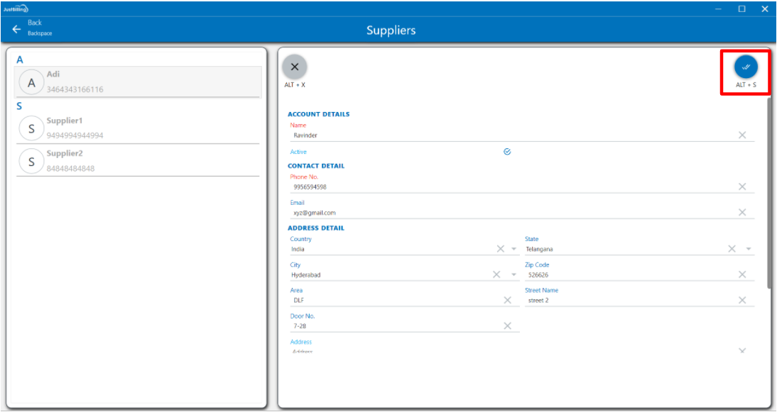 5. On Saving, the Suppliers page is updated and reflects in JB Windows application under Suppliers page.