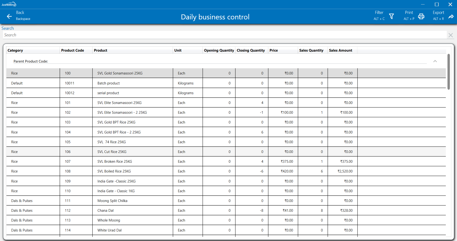 This "Daily business control" report provides a detailed overview of your product inventory and daily sales activity. For each "Product," you can track its "Opening Quantity," "Closing Quantity," and the "Sales Quantity" along with the "Sales Amount." This report is essential for monitoring your stock levels and daily sales performance for each item.