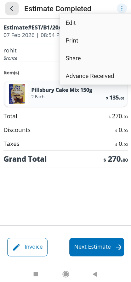 The Estimation Generated screen displays the summary of items added to an estimate along with customer details, pricing breakup, and available next actions. This screen is typically accessed after completing an estimation in the billing workflow.