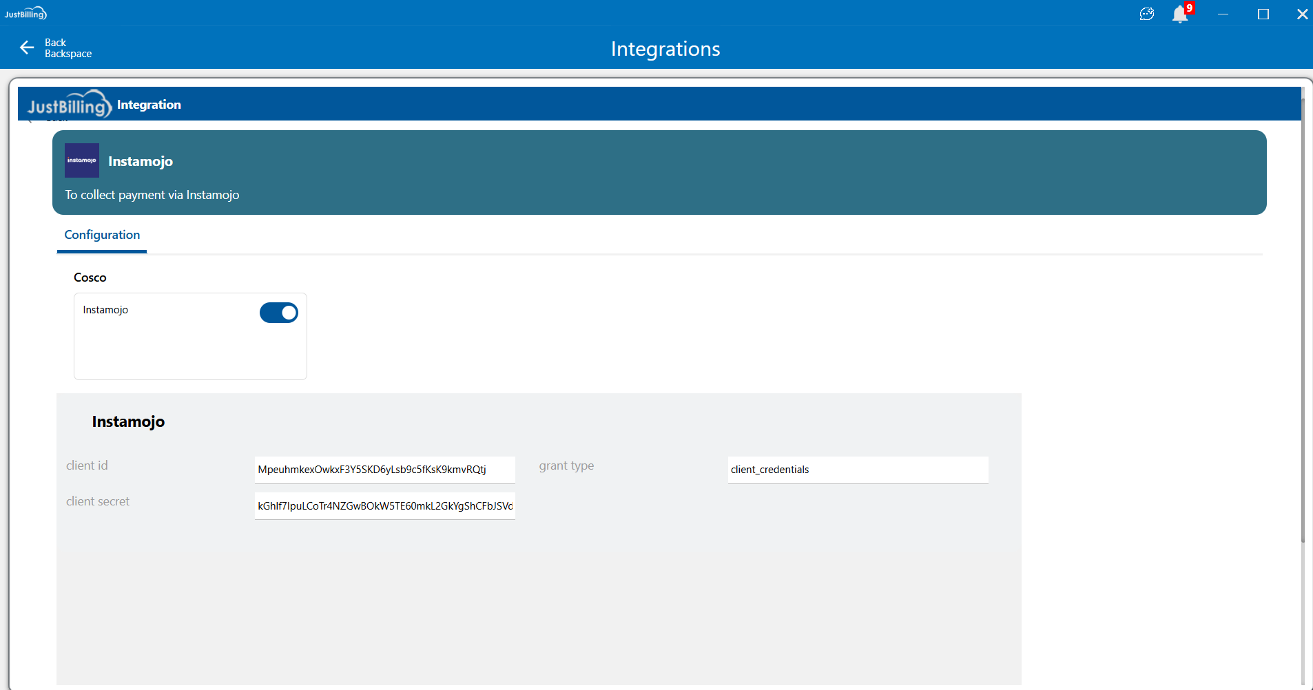 - Used for authenticating your JustBilling application with Instamojo servers.