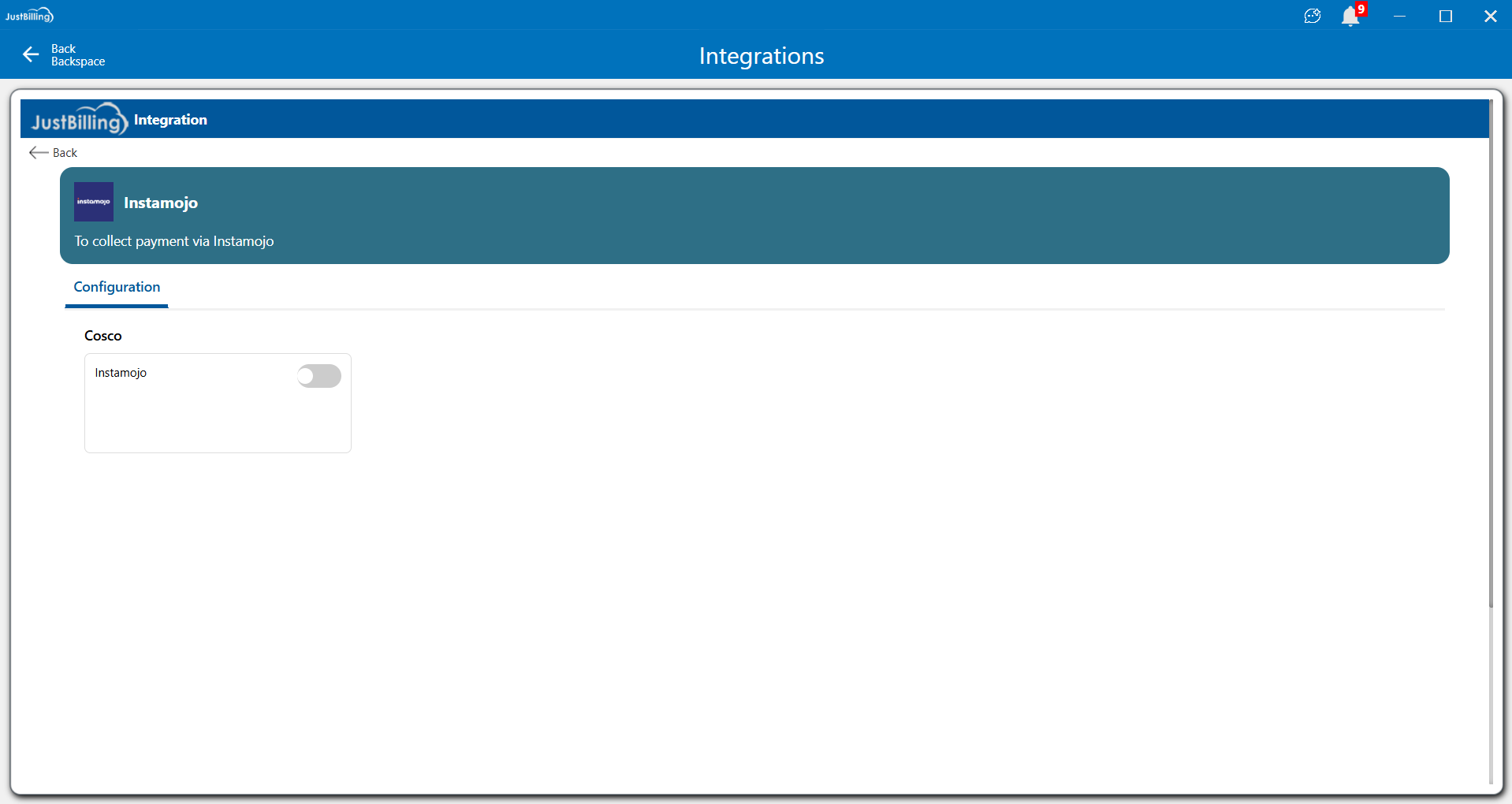 This section explains how to enable, configure, and manage Instamojo credentials inside the JustBilling application.