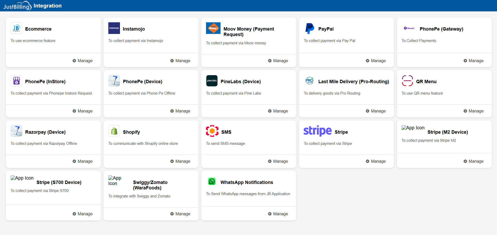 The Integrations module allows JustBilling users to connect with various third-party platforms for payments, ecommerce operations, delivery routing, and customer communication. Each integration can be configured individually based on the business requirement. The Integrations dashboard displays all available connectors along with a short description and a Manage button for configuration.