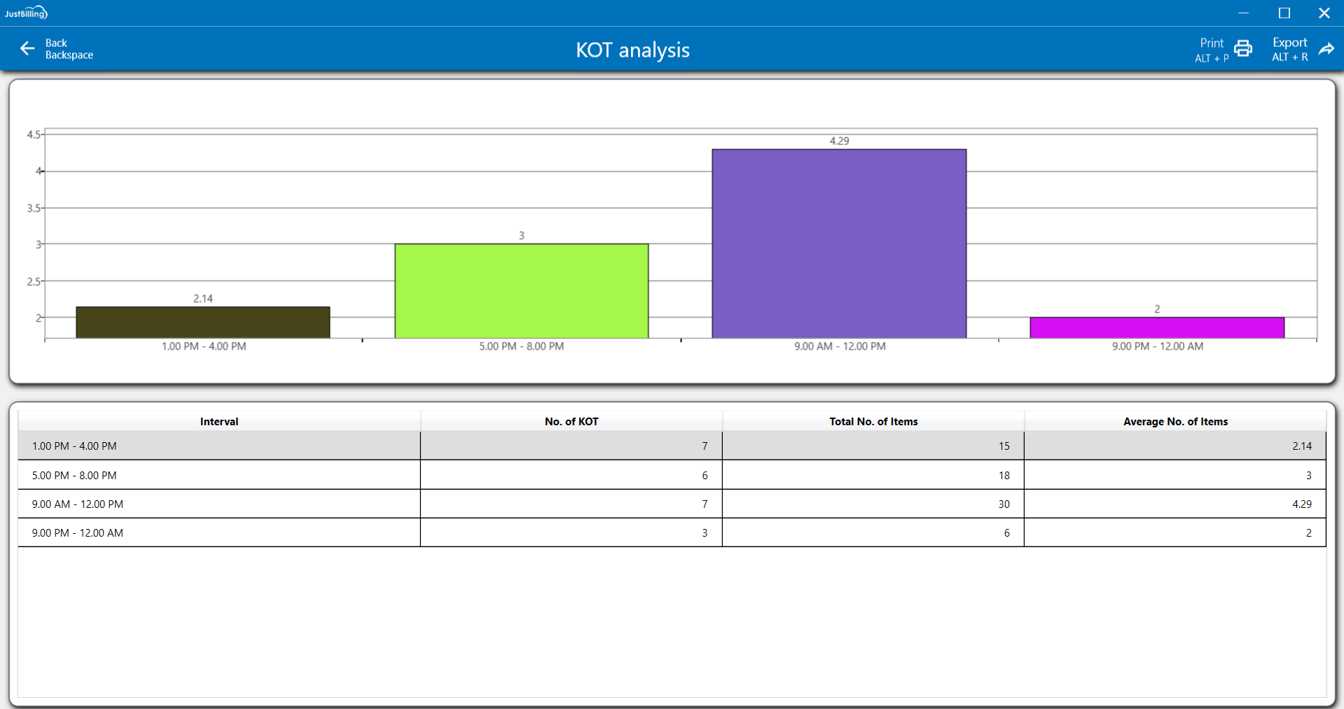 This "KOT analysis" report provides insights into your Kitchen Order Ticket (KOT) activity across different time "Intervals." For each period, you can see the "No. of KOT" generated, the "Total No. of Items" ordered, and the "Average No. of Items" per KOT. This helps you identify peak order times and manage kitchen workflow more efficiently.