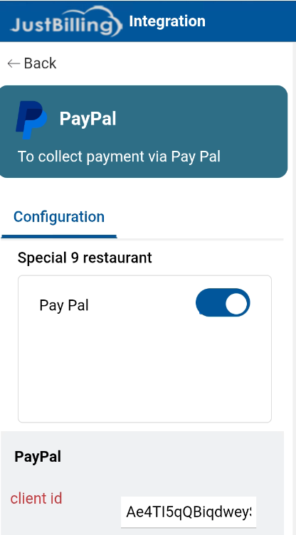 This section explains how to configure and enable PayPal payment integration in the JustBilling Integration module to collect payments via PayPal.