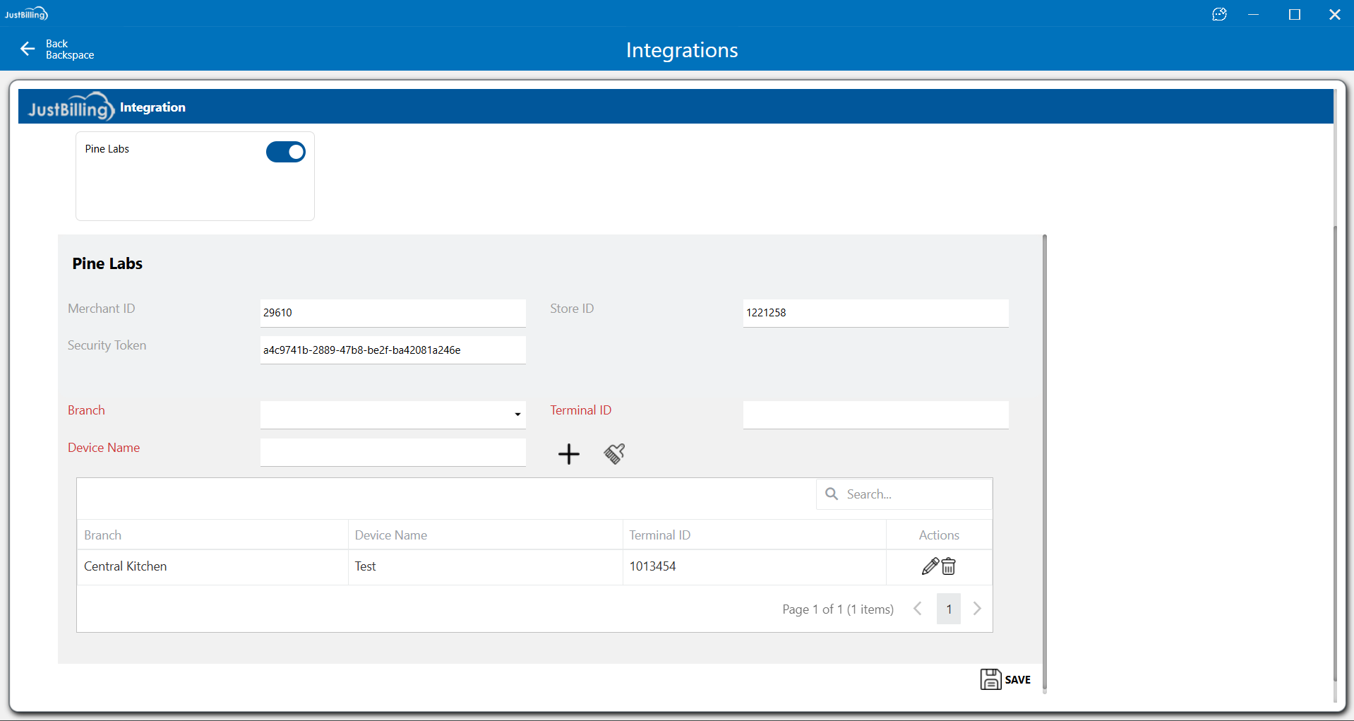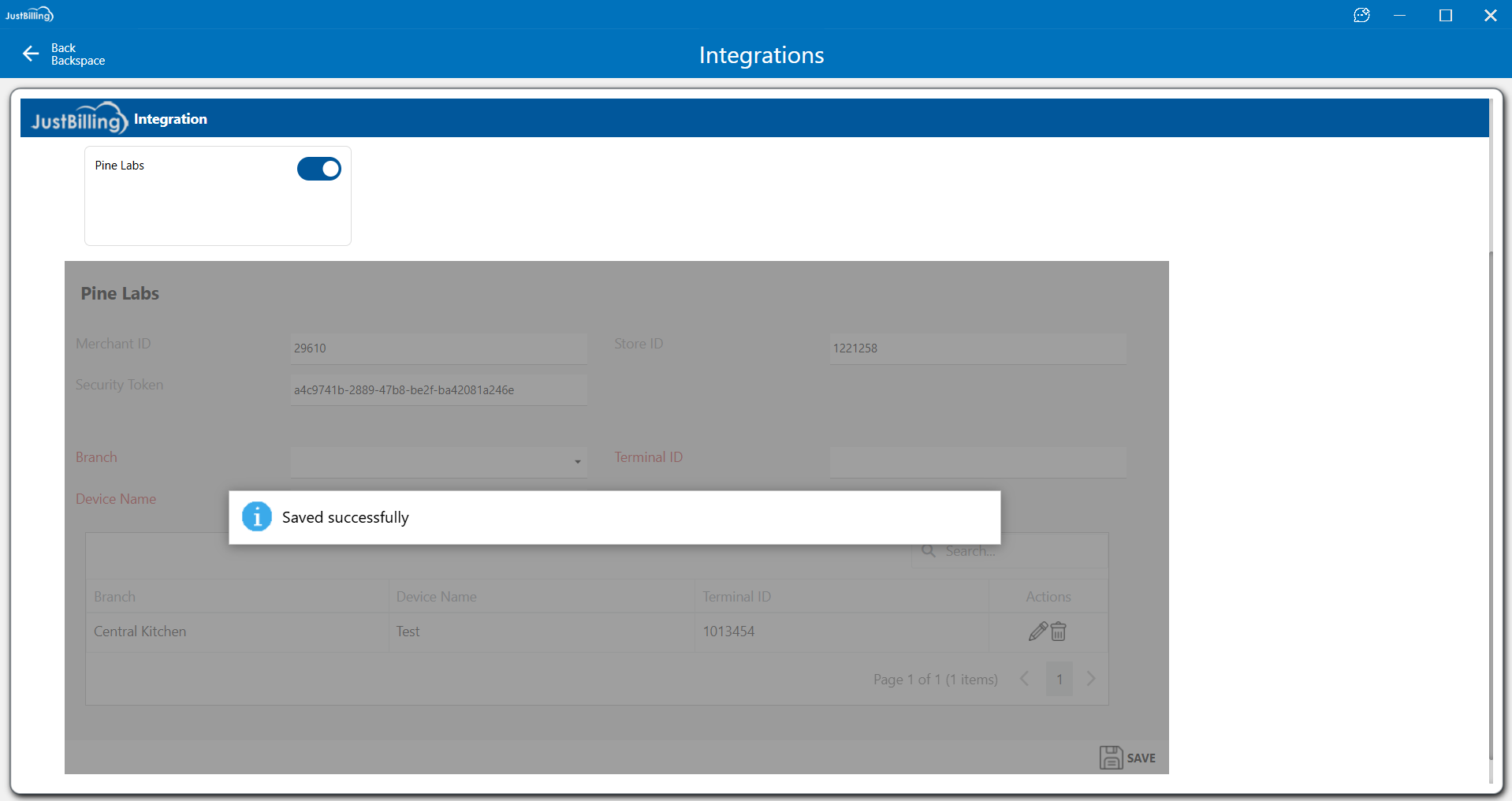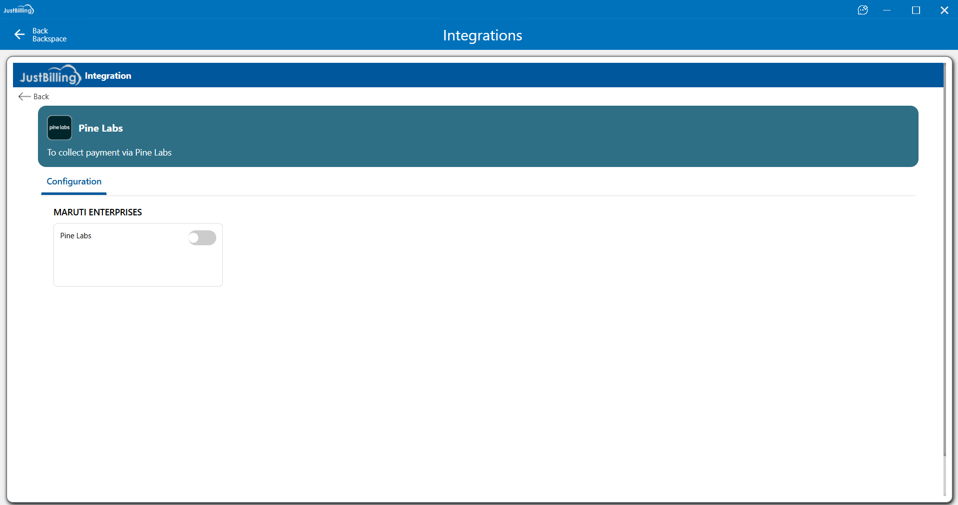 The Pine Labs Integration enables JustBilling to connect with Pine Labs card-swiping/POS terminals to accept card payments seamlessly. After configuration, card transactions can be processed directly through the connected Pine Labs terminal.