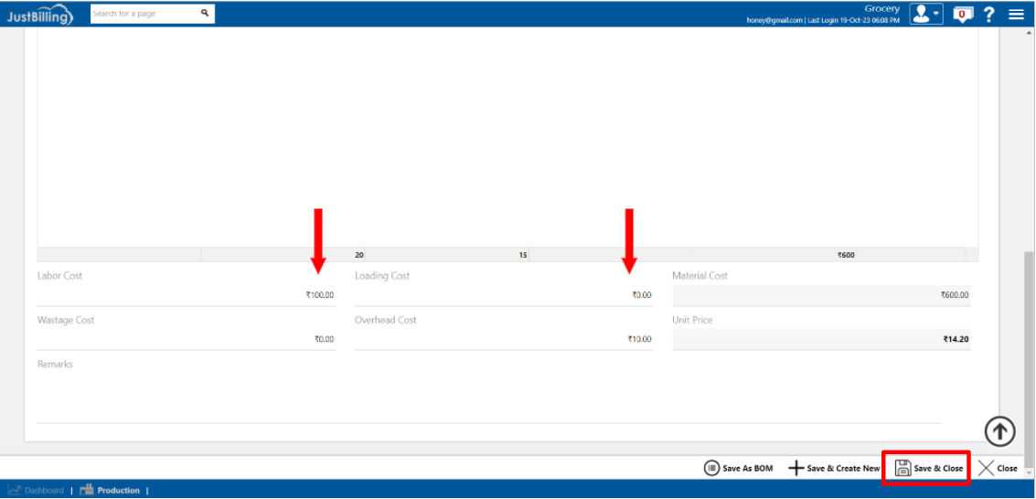 Note: When you enter the Quantity for raw materials, application automatically calculates its cost price. If you want to add additional costs such as the labor cost, overhead cost, loading cost and wastage cost, you can do so manually and Save the record. The unit cost of production in this case will be calculated by considering the Material Cost + Additional Cost (Labor/Overhead/Loading/Wastage).