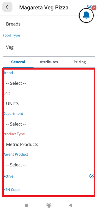 I.Food type:Select Veg / Non-Veg for food items.Used for food classification and compliance.
