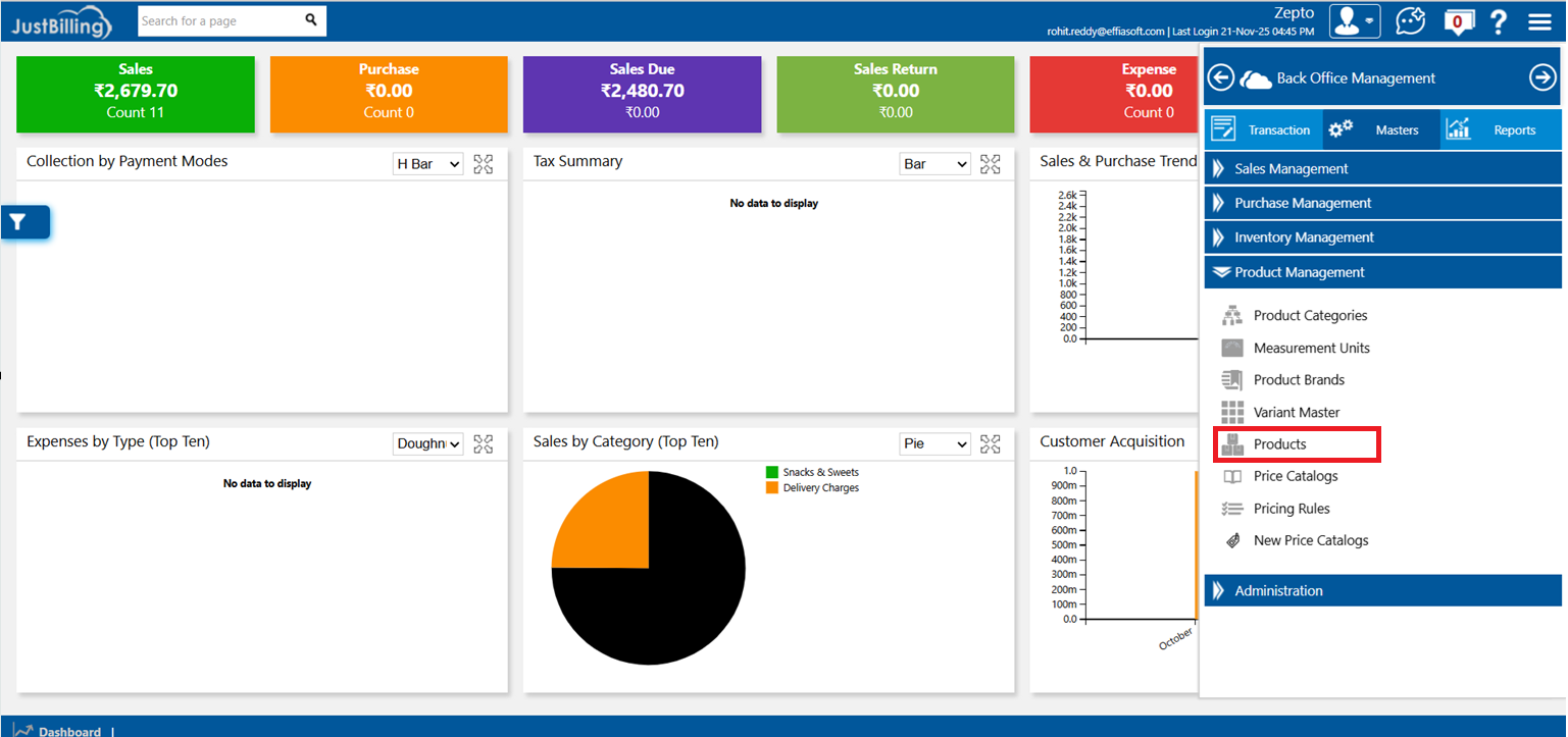 From Masters - Another option to create the product is from Menu > Masters > Products as shown in the below screen shot. (see figure 1)