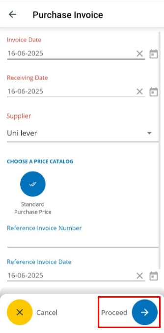 - Tap on Proceed and Finish to generate purchase invoice. ( It is possible to create Purchase invoice against due payment with the supplier ) (see figure 6)