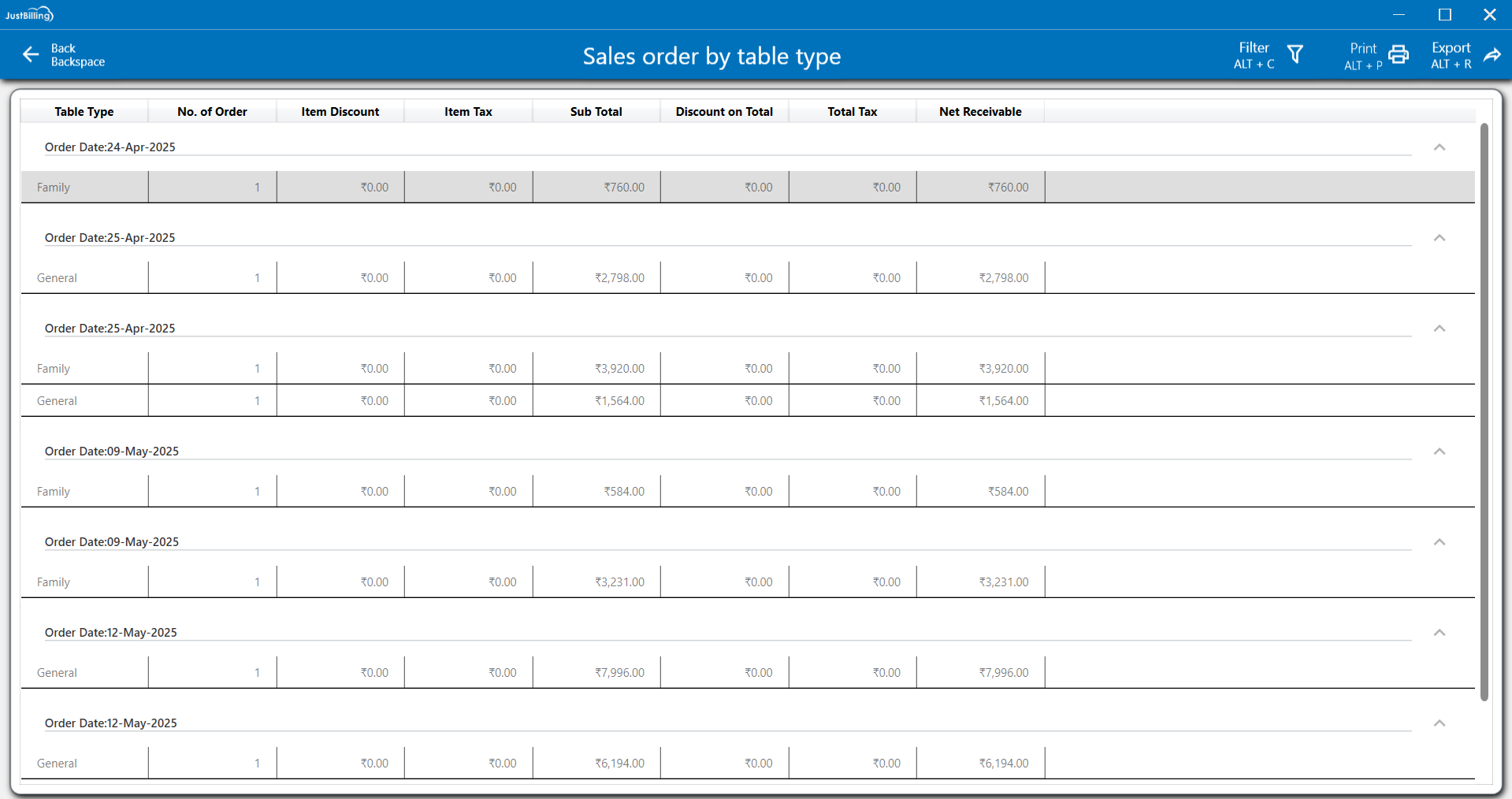 This "Sales order by table type" report organizes your sales orders by categories like "Family" or "General," based on their "Order Date." For each order, you can view the "No. of Order," "Sub Total," and the final "Net Receivable" amount. This helps you analyze sales performance and revenue generated from different table types or service areas.