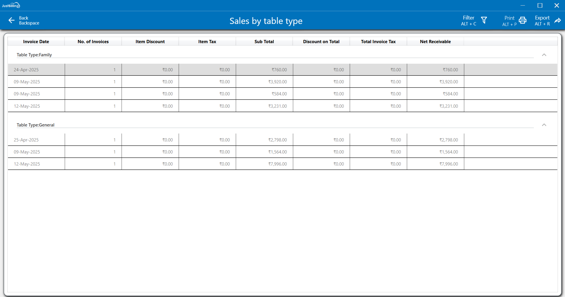 This "Sales by table type" report breaks down your sales based on where they occurred, such as "Table Type Family" or "Table Type General." For each "Invoice Date," you can see the number of invoices, any discounts, and the "Net Receivable" amount. This report helps you analyze sales performance by different service areas or table configurations.