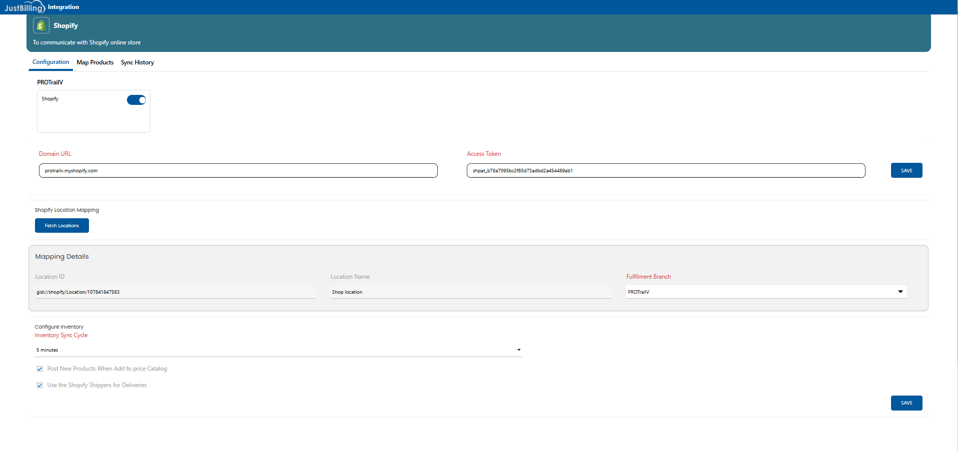 The Configuration tab is used to connect JustBilling with a Shopify store and configure sync behavior.