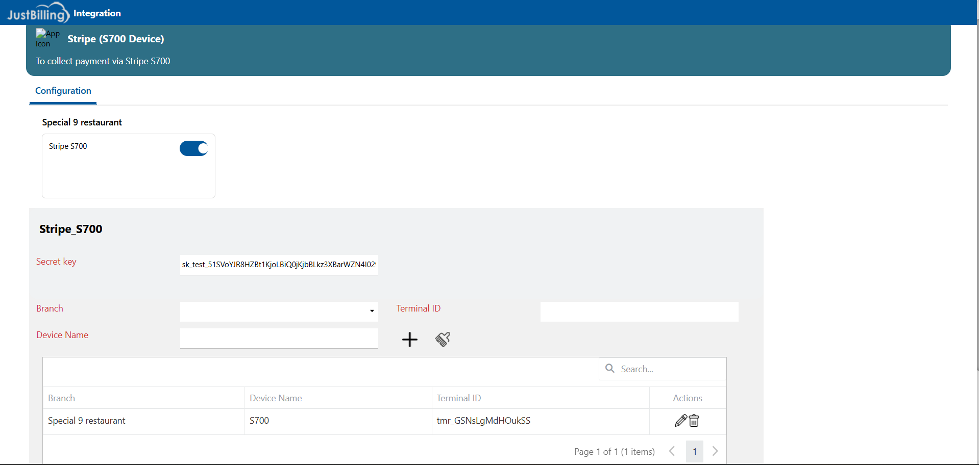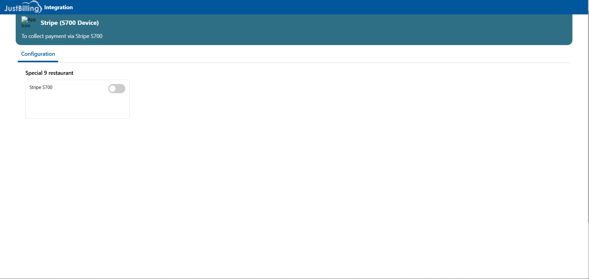 - Turn the toggle ON to enable Stripe S700 for the selected restaurant.