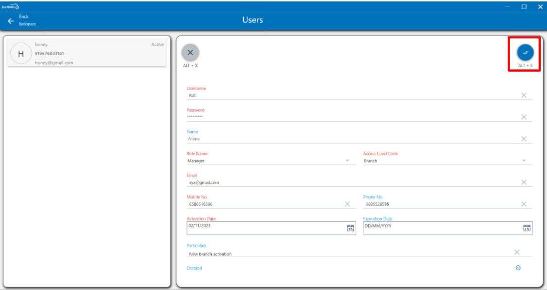 11. On saving, the User reflects in the JB Windows application under the Users page