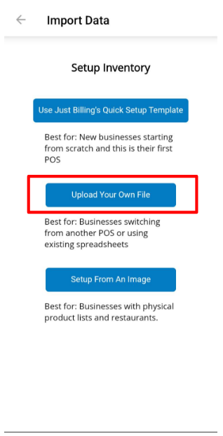 You can choose any of the options - Use just billing quick import template, upload your own file, setup from an image and scan menu (for restaurant) (See figure 3 )