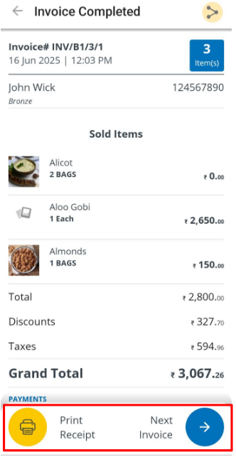 - Once the order is created if you want to create the invoice then recall from Invoice screen.