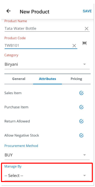 - Check or un check the buttons for Allow negative stock, Active, Return allowed, Purchase item, Sales item.