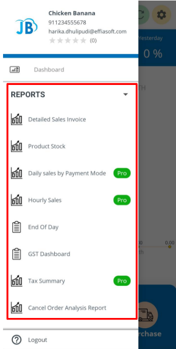 In this topic we will briefly discuss about the different reports that are available under Reports in the Just Billing app (as below).