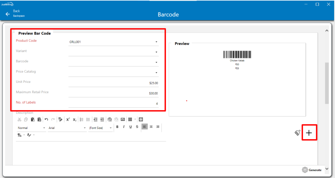 7. Preview Barcode : You can preview barcode by Entering Product code, variant, Barcode, Price catalog, Unit price, Enter description
