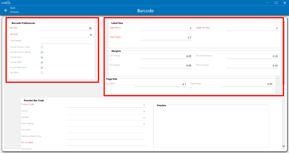 2. Enter Barcode Preferences like Bar size, Text size, Label Header