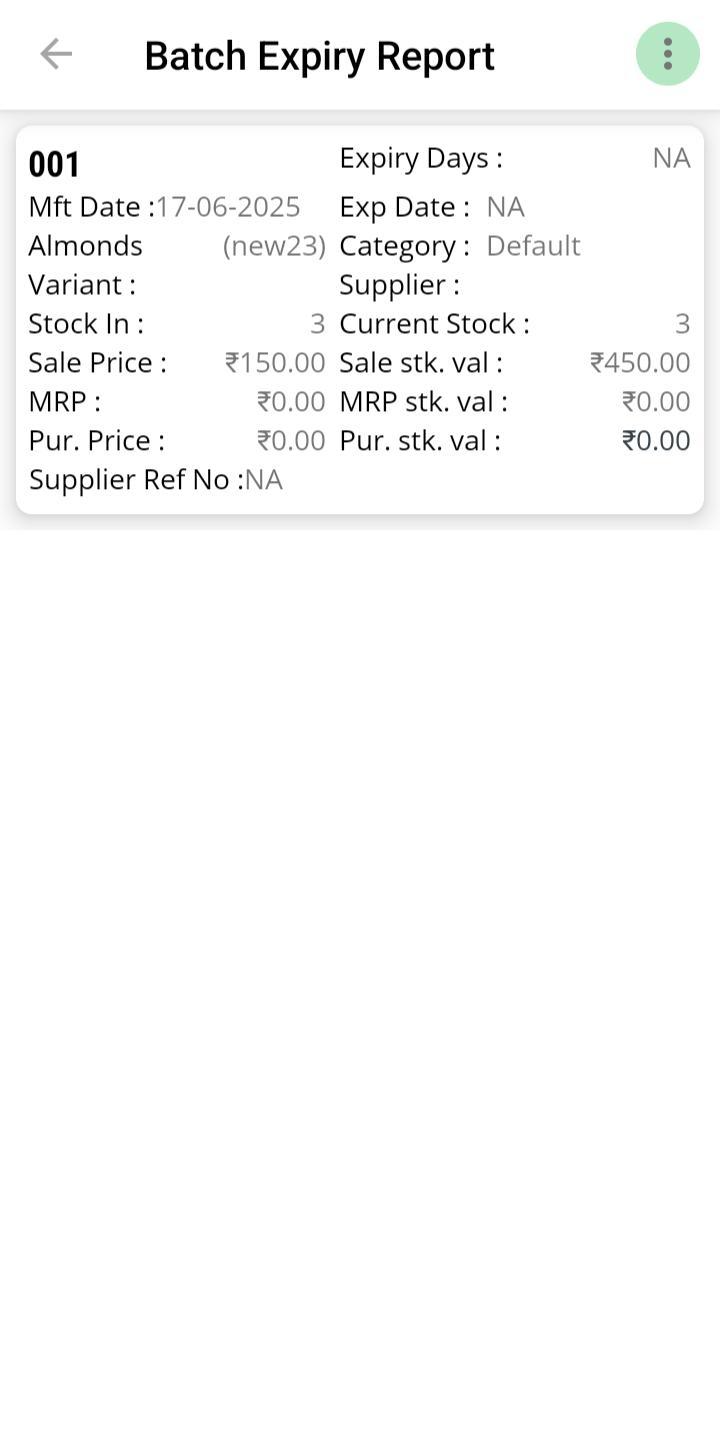 This "Batch Expiry Report" shows important details about your inventory, like "Almonds" with product code "new23." You can see the manufacturing date (17-06-2025), current "Stock In" and "Current Stock" quantities, and their associated values. This helps you monitor product freshness and stock levels effectively.