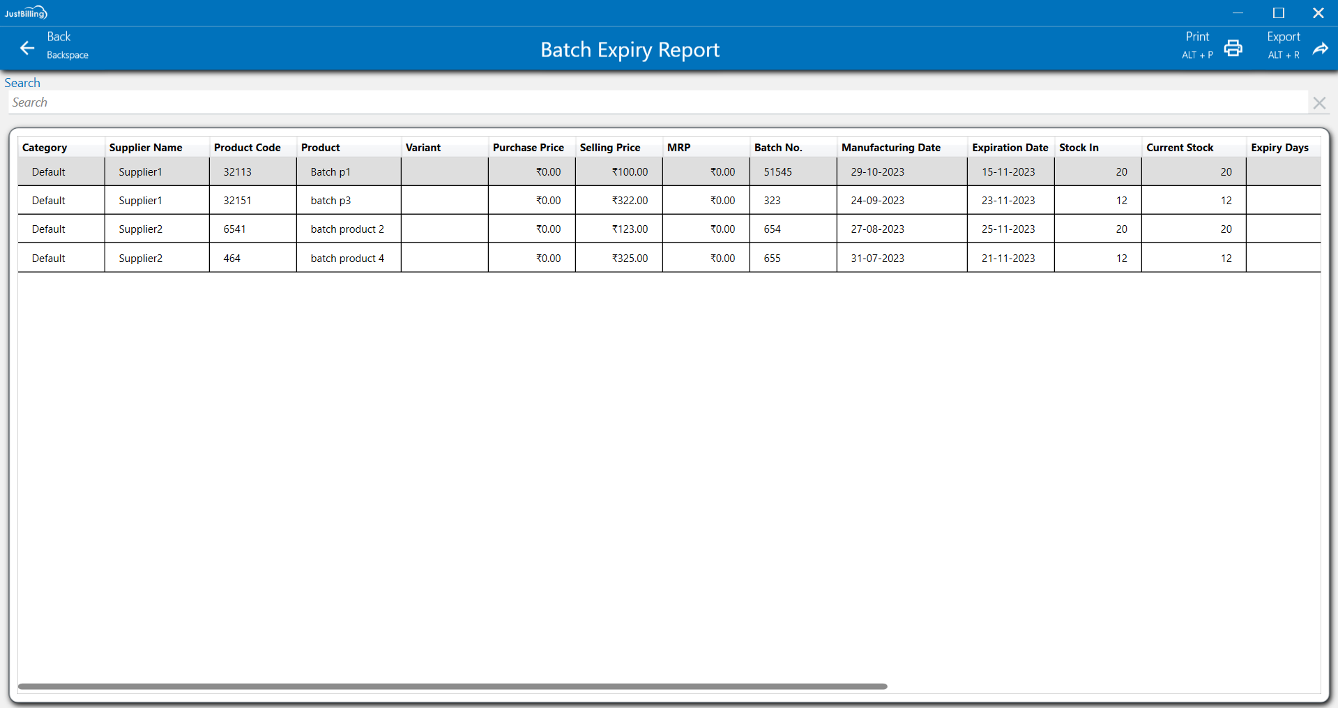 This "Batch Expiry Report" shows important details about your inventory, like "Almonds" with product code "new23." You can see the manufacturing date, current "Stock In" and "Current Stock" quantities, and their associated values. This helps you monitor product freshness and stock levels effectively.