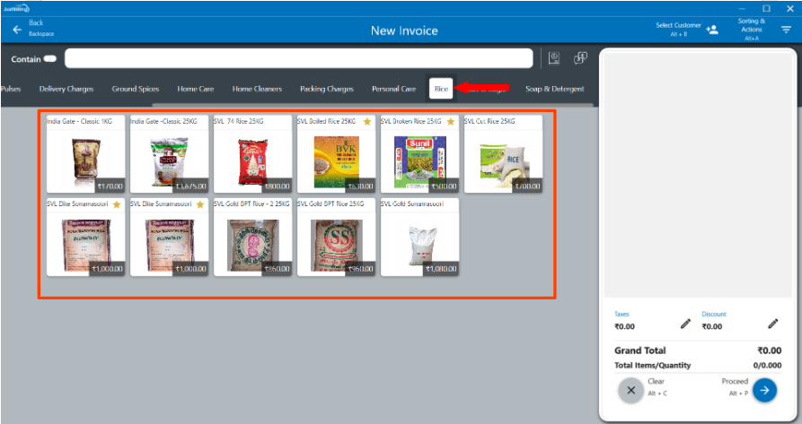 6. From the Categories section, select a category to view products under that category. For example, if you select rice category, it will show all the type of rice in the list of products (see figure 6).