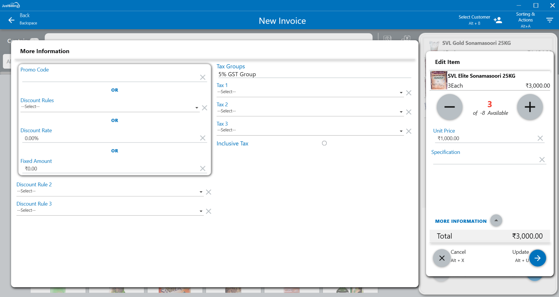 To apply discount on the product or item, click on more information where you can apply promo code, discount rules and taxes mapped with the item and click Update (see figure 6).