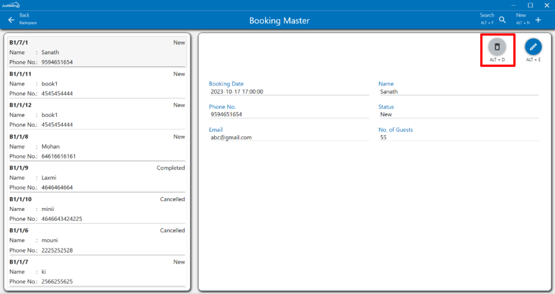 2. Click on Yes to delete the Booking, then the record will be deleted.