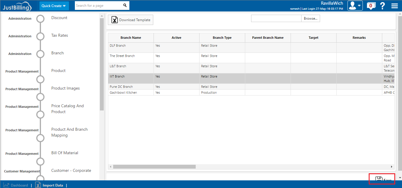 - After the excel has been uploaded into application, you need to select an option from left pane(Discount, Tax, Branch etc) , the corresponding data entered in the excel worksheet will appear in the right pane of the screen. Click on the Save button to import the data.