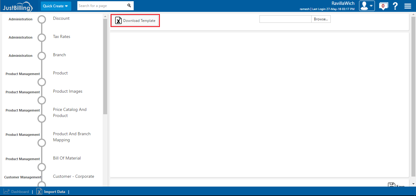 Import Data functionality allows end users to dynamically import data (e.g product, price list, customer, discount etc) from excel into JustBilling application. This is especially useful during initial set up while implementing Just Billing. Importing data is like moving out to a new home. If you clean and organize your possessions before you move out, settling down in your new home would be much easier. So please take some time to prepare and clean your data before importing into the application :