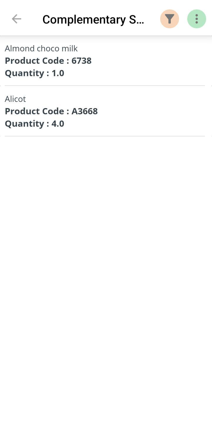 This "Complementary Sales" report shows details of products given as complimentary items, like "Almond choco milk" and "Alicot." For each item, you can see its specific "Product Code" and the "Quantity" provided. This report helps you track inventory given away for promotional or other purposes.