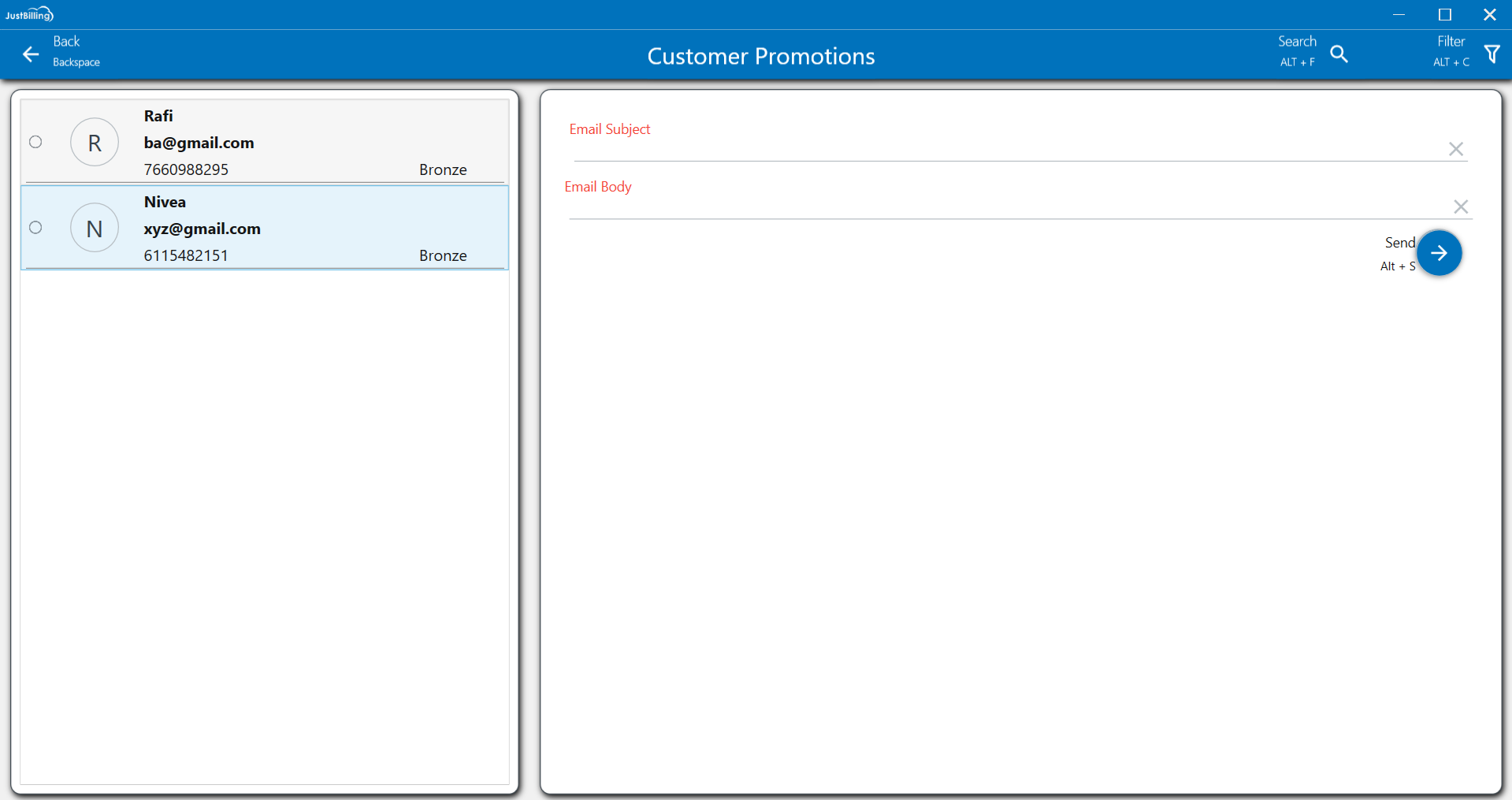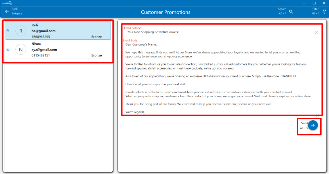 - Then click on send, Up on sending the selected customers will receive an Email in to their Email ID.