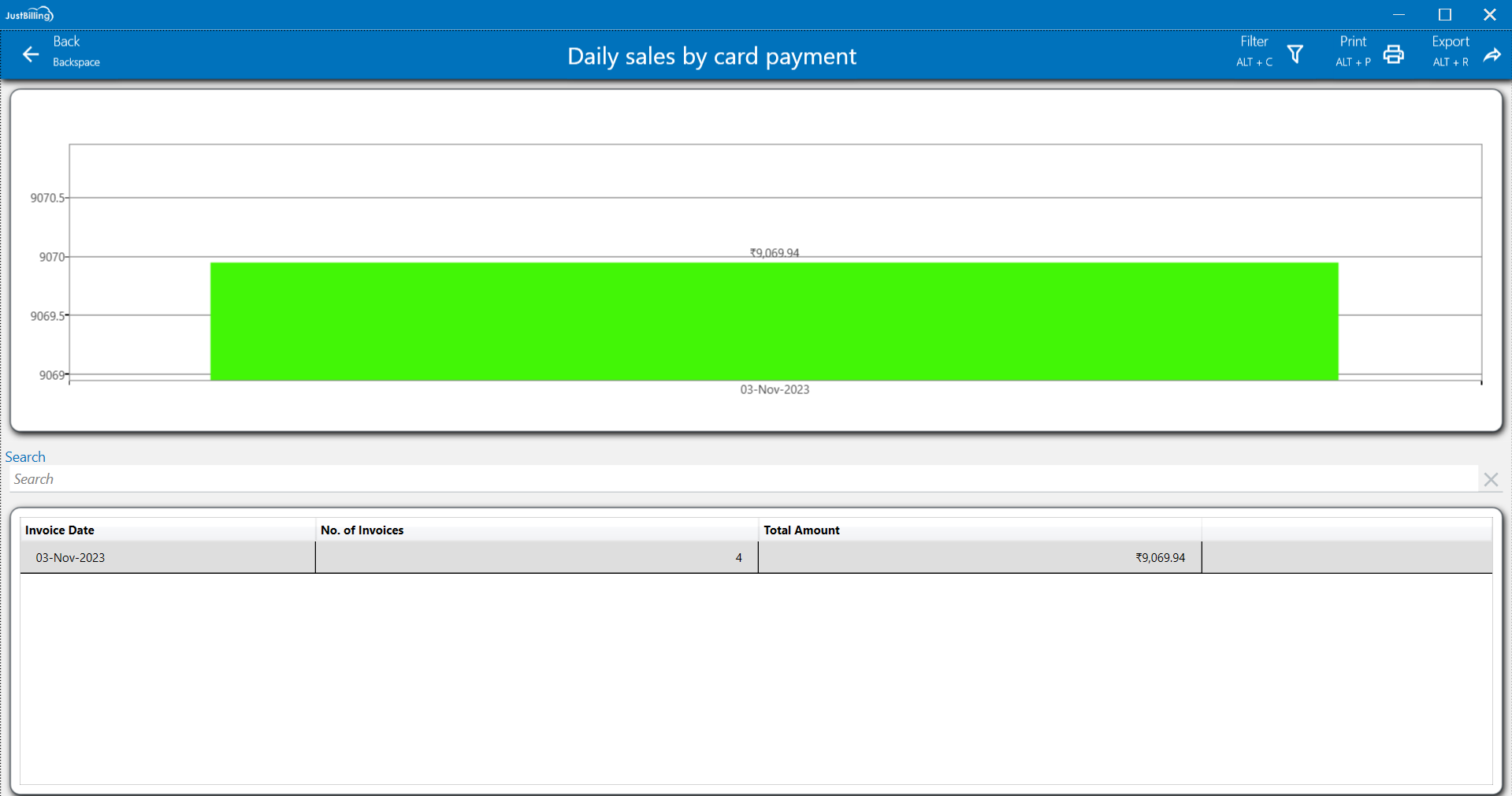 This "Daily sales by card payment" report summarizes your card transactions for specific dates, such as November 3, 2023. For each date, you can quickly see the "No. of Invoices" paid by card and the "Total Amount" collected. This helps you track your daily payment received by card.